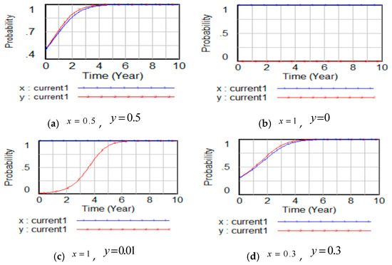 Simulation analysis is performed with initial parameters, and the evolution results are shown in Figure 5a. As the game progresses, both players reach equilibrium in strategic cooperation strategies. When the strategies of both players are pure strategies, the evolution results are shown in Figure 5b and the strategies of both players are in a stable state. , adjust , and the evolution results are shown in Figure 5c. Although the initial probability of the Lao side choosing strategic cooperation is very low, as long as the participating players find that there is a higher-yield strategic choice in the system, they will adjust through mutual imitation of the original strategies; the system evolves to a new equilibrium state. When the initial probability of both players becomes low, the evolution result is shown in Figure 5d, and the time for both parties to reach the equilibrium state of strategic cooperation becomes longer.
