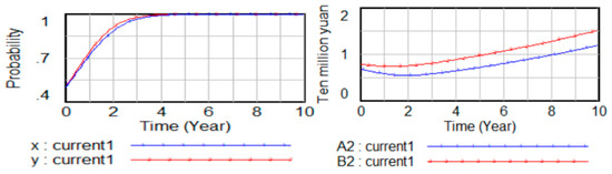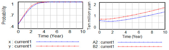 The simulation results when the average transaction cost of strategic cooperation electricity is 0.11 are shown in Figure 7. It can be seen from the comparative analysis of the simulation results of Figure 4 and Figure 5a that the average transaction cost of electricity is 0.1 when strategic cooperation is under the initial parameters. The average transaction cost of electricity increases, the time to reach the equilibrium state of strategic cooperation becomes longer, and the benefits of cooperation between both players decrease.