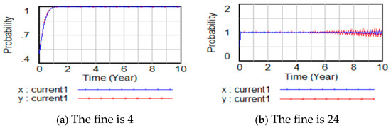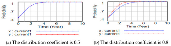 The simulation results with excess returns distribution coefficients of 0.5 and 0.8 are shown in Figure 14. Comparative analysis with Figure 5a of the simulation results with the distribution coefficient of 0.6. It can be seen that the closer the distribution coefficient is to 0.5, the shorter the time for both players to simultaneously reach the equilibrium state of strategic cooperation strategies.