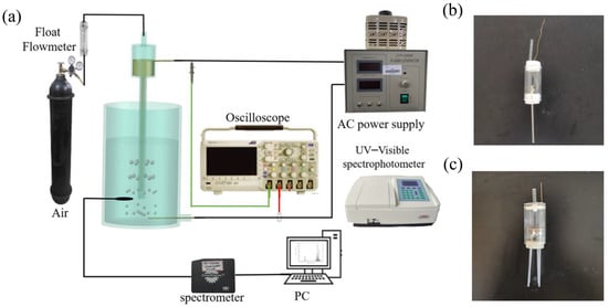 The experimental system, as shown in Figure 1a, consists of a single-tube plasma discharge system comprising four components: power supply, optoelectronic detection, carrier gas, and discharge tube. The power supply utilized is a high-frequency plasma-dedicated power supply (Nanjing Suman CTP-2000K, Nanjing, China). The optoelectronic detection system comprises an oscilloscope (Tektronix MOD3024, Beaverton, OR, USA), with the X channel using a 1:1000 high-voltage probe (Tektronix P6015A) and the Y channel using a current probe (Tektronix P6021), along with a miniature fiber optic spectrometer (OtO SE2030-010-FUV, Taiwan, China). The carrier gas system includes an air pump and flowmeter, with a gas flow rate of 2 L/min. The discharge device adopts a needle-like structure Figure 1b, consisting of a single hollow stainless steels tube and a single quartz tube. The quartz tube is 65 mm long, with an inner diameter of 2 mm and an outer diameter of 3 mm, while the stainless steels tube is 90 mm long, with an inner diameter of 1 mm and an outer diameter of 2 mm. The stainless steels tube is inserted into the quartz tube, with its bottom end retracted into the quartz tube and positioned 5 mm away from the bottom edge. The positive pole of the power supply is connected to the stainless steels tube, and a copper wire is connected to the negative pole, which is inserted into the solution to be treated. The volume of MV solution for degradation is 200 mL, with an initial concentration of 50 mg/L, prepared by dissolving MV powder in tap water. The absorbance of the MV solution is measured using a UV–visible spectrophotometer (METASH UV-5100B, Shanghai, China). To improve the degradation efficiency of the solution and explore the optimal effect of underwater bubble discharge, the mass transfer of the plasma discharge system is increased. The single plasma discharge tube is upgraded to four needle tubes arranged in a 2 × 2 array, with each needle tube maintaining the same size. Figure 1c depicts a physical representation of the four-tube discharge device, and the schematic diagram of discharge device is depicted in Figure S1.