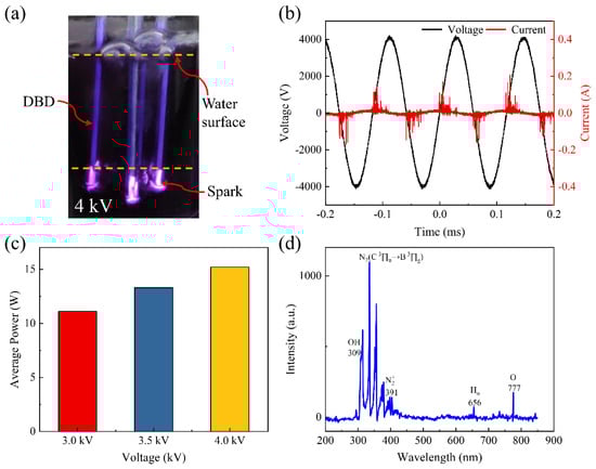 To explore the optimal effect of jet bubble discharge and enhance the diffusion and mass transfer of RONS produced by plasma, the single plasma discharge tube was upgraded to four needle tubes arranged in a 2 × 2 array configuration, connected to the same gas chamber for collective discharge, forming an underwater PBA discharge device. Figure 2a displays an image of the PBA discharge captured by a standard color camera, clearly showing the production of purple-blue light at the end of the discharge tubes. This phenomenon occurs because the gas in the jet space is ionized to form low-temperature plasma. The air ionization process produces purple-blue plasma, and as the discharge voltage increases, so does the light’s intensity [17,18]. The typical DBD region and spark discharge region of the underwater interface can be observed, as indicated by the arrows. Figure 2b illustrates the voltage–current waveform obtained by the oscilloscope during air discharge when the peak discharge voltage is 4.0 kV and the frequency is 9 kHz. The current waveform exhibits periodicity corresponding to the voltage, with numerous filamentous pulse peaks appearing at the rising and falling edges of the voltage waveform. Moreover, the peaks are more pronounced at the falling edge of the voltage, with each filamentous pulse peak representing a discharge of filamentous arc. The actual power of the PBA discharge device is calculated using the Lissajous figure method. As shown in Figure 2c, when the input frequency is 9 kHz and the working gas is air, the actual discharge power of PBA corresponding to discharge voltages of 3.0 kV, 3.5 kV, and 4.0 kV is 11.1 W, 13.3 W, and 15.2 W, respectively. This demonstrates that under the same frequency and working gas conditions, the actual power of the discharge device is positively correlated with the discharge voltage. As the discharge voltage increases, the actual discharge power of the device also increases. Particles and ions in excited states can be diagnosed through the analysis of plasma emission spectra. Figure 2d depicts the emission spectrum of underwater bubble discharge plasma from the device. The emission spectrum of air plasma mainly includes the second positive system of nitrogen molecules N2 (C3Πu→B3Πg) and the weak intensity N2+ band peak (B2∑u+→X2∑g+) of the first negative system (FNS) of nitrogen molecular ions. An oxygen atom peak may be seen in the air plasma emission spectrum at 777 nm. This peak is mostly the result of energy collisions between electrons and air oxygen molecules () [19,20]. Furthermore, the emission line of ∙OH at 309 nm and the peak of ∙H radical () at 656 nm are also observed. This is due to the dissociation of the water vapor by collision with the electrons in the plasma () [15].