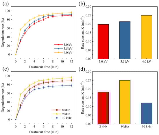 The effect of different voltages and frequencies on MV degradation rate. (a) The effect of voltage on MV degradation rate; (b) reaction kinetics constants at different voltage for 12 min; (c) the effect of frequency on MV degradation rate; (d) reaction kinetics constants at different frequency for 12 min.
