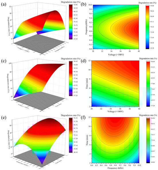Simulation response surface and contour plots of MV degradation rate. (a,b) Interactive effects of input voltage and frequency; (c,d) interactive effects of input voltage and treatment time; (e,f) interactive effects of frequency and treatment time.