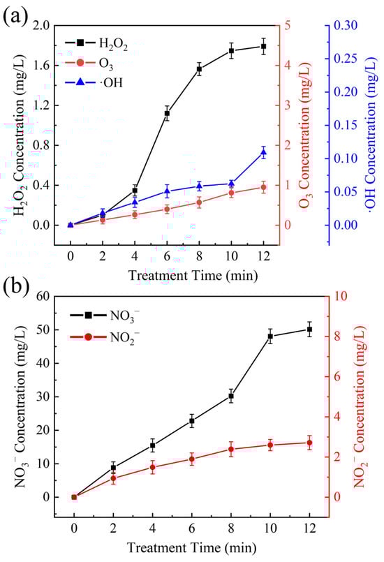 H2O2 concentration reached 1.79 mg L−1 at 12 min. H2O2 may be generated by the following processes: water molecules decompose under high-energy electron bombardment in excited plasma or undergo recombination of ⋅OH [26], as shown in Equations (7) and (8):