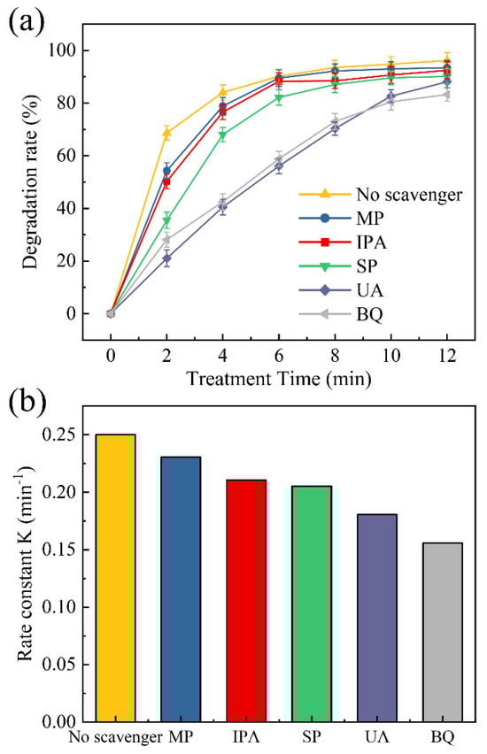 Five scavengers (BQ, UA, SP, IPA, and MP) were also used to explore the effect of various active species (·O2−, O3, H2O2, ·OH, and e*) on the MV degradation rate, as shown in Figure 6. The effect of scavengers on degradation efficiency was as follows: BQ > UA > SP > IPA > MP. The MV degradation was 96.15% after 12 min of air plasma treatment without inhibitor addition, and the removal efficiency decreased to 83.2%, 88.1%, 90.1%, 92.4%, and 93.4% with the addition of BQ, UA, SP, IPA, and MP, respectively, as shown in Figure 6a. This also indicated that the contribution of active substances in the degradation process followed the order: ·O2− > O3 > H2O2 > ·OH > e*. In addition, Figure 6b demonstrated the different reaction rates between each inhibitor and the active substance, respectively. The reaction rates k after the addition of BQ, UA, SP, IPA, and MP were 0.156, 0.181, 0.205, 0.211, and 0.231 min−1, respectively. The calculated inhibition rates are summarized in Table S5. Moreover, the inhibition rates were 37.7%, 27.8%, 17.9%, 15.8%, and 7.8%, respectively. This implied that ·O2−, O3, H2O2, ·OH, and e* contributed 37.7%, 27.8%, 17.9%, 15.8%, and 7.8%, respectively, to the MV degradation. These results revealed that the short-lived superoxide anion radical and long-lived ozone produced during the plasma discharge had a greater influence on MV degradation, while hydrogen peroxide, hydroxyl, and hydrated electrons contributed slightly less. However, the difference in the contributions of the five reactive species was not particularly significant, and this is also consistent with the results reported in most references [22,23].