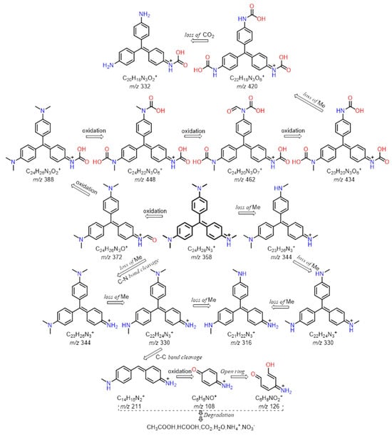 The molecular structure of MV is mainly composed of a benzene ring and ternary ring. Based on LC-MS analysis, Figure S4 showed that 15 intermediates were detected during MV degradation. The determined results, including retention time (tR), molecular formula, mass-to-charge ratio (m/z), structural formula, are summarized in Table S6. By analyzing the obtained intermediates, two possible pathways for MV degradation were hypothesized, as shown in Figure 7. The initial substrate (ionization in ESI-MS gave the quasi-molecular ion peak [M]+ as m/z 358) was analyzed, and it was found that the degradation behavior of MV was mainly characterized by the occurrence of a process of C-N bond rupture to remove the methyl group and the successive oxidation of the methyl group. The first reaction pathway could be a demethylation of the substrate m/z 358 by C-N bond breaking to give the product m/z 344 (there are two different scenarios), and then the further removal of the methyl group by C-N bond breaking gives the product m/z 330. Next, N-methylaniline was removed by C-N bond breaking to give the product m/z 211, N-methylaniline was removed by C-C bond breaking to give the product m/z 108, and continued degradation exhibited oxidative ring-opening to give the product m/z 126. The second reaction pathway may be from the substrate m/z 358 by the oxidation of N-methyl to carboxyl to give the product m/z 388; by successive oxidations to give the product m/z 448; by oxidation of methyl to give the product m/z 462; by oxidation of aldehyde groups and decarboxylation in the form of CO2 to give the product m/z 434; by demethylation or by undergoing methyl reoxidation decarboxylation to obtain the product m/z 420; and then by successive decarboxylation to obtain the product m/z 322. The above products are further degraded to produce small molecule acids such as acetic acid, formic acid, H2O, CO2, NO3−, NH4+, etc., thus achieving the complete degradation of the compounds.