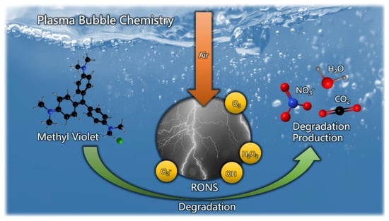 - Wang, X.; Wang, F.; Zeng, X.; Zhang, Q.; Zhang, W.; Le, J.; Yang, S. Decolorization of methyl violet in simulated wastewater by dielectric barrier discharge plasma. Jpn. J. Appl. Phys. 2015, 54, 056201. [Google Scholar] [CrossRef]