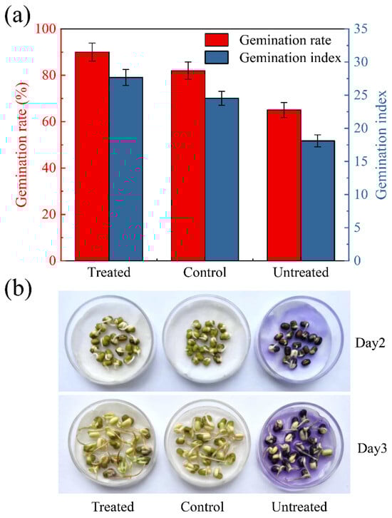 The germination experiment of mung bean seeds and ion chromatography, as shown in Table S7, was used to further evaluate the toxicity of MV solution and its degradation products. In the present study, mung bean cultures were obtained using an ultrapure water (control group), an untreated MV solution (untreated group), and a plasma-treated MV solution (treated group). The germination status of mung beans during the first three days is shown in Figure 9. The germination rates of mung beans in the control and untreated groups were 82% and 65%, respectively. The germination rate of the treated group increased to 90%, as shown in Figure 9a. It can also be observed that the mung beans in the treated group showed better growth compared to the control group and the untreated group, as shown in Figure 9b. This indicates that the toxicity of the solution gradually decreases during the degradation process.