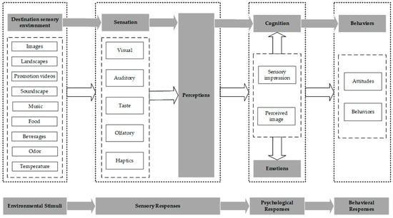 Sensory stimuli function as subconscious impulses that influence consumer behaviors []. Sensory marketing is a strategy that employs the five primary sensory modalities (visual, auditory, olfactory, taste, and haptics) to influence consumer emotions and behaviors [,]. The sensory marketing theory suggests that humans interact with their environments through their senses, creating initial perceptions that trigger emotional and behavioral reactions (see Figure 1) []. Due to a growing academic interest in sensory experiences, sensory marketing has quickly developed and has been widely utilized in tourist studies.