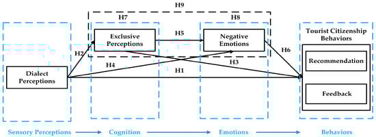 According to the theory of sensory marketing, environmental factors such as auditory, images, and olfactory in tourist destinations stimulate tourists’ sensory perceptions such as visual and auditory, which in turn affect tourists’ psychological factors such as cognition and emotions, and form corresponding attitudes and behaviors [,,]. Based on the above theoretical hypothesis, this study selected the destination dialect as the factor of host–guest interactions, exclusive perceptions and negative emotions as the psychological factors of tourists, and the citizens’ behavior as the attitudes and behaviors of tourists, and then constructed the model of “Sensory Perceptions–Cognition–Emotions–Behaviors” (see Figure 2). The relationship between tourists and destinations is influenced by the auditory elements of the destination language. This link has a profound effect on the tourists’ perceptual experience, in particular exclusive perceptions, which subsequently triggers a range of emotional and behavioral responses. These responses can range from negative emotions to tourist citizenship behavior.