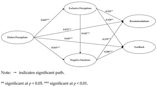 The data analysis in Table 6 and Figure 3 shows that young tourists’ recommendation behaviors (β = 0.472, p < 0.01) and feedback behaviors (β = 0.410, p < 0.01) are highly influenced by their destination dialect perceptions. In contrast, it was determined that there were no substantial adverse consequences. The findings suggest that young tourists’ destination dialect perceptions motivate recommendation and feedback behaviors. Therefore, hypotheses H1a and H1b are confirmed. The results suggest that how young tourists perceive the local accent of a destination plays a significant role in influencing their citizenship behaviors. The study found that the exclusive perceptions hurt recommendation behaviors (β = −0.121, p < 0.05) and feedback behaviors (β = −0.129, p < 0.05). Therefore, hypotheses H3a and H3b have been verified. Since exclusive perceptions positively affect negative emotions (β = 0.142, p < 0.01), the results of this study also support H5. In addition, the study revealed that negative emotions have a significant negative impact on recommendation behaviors (β = −0.170, p < 0.01) and feedback behaviors (β = −0.206, p < 0.01), thereby confirming hypotheses H6a and H6b. This highlights the significance of negative emotions as a crucial element contributing to tourists’ decline in citizenship behaviors. At the same time, this study found that destination dialect perceptions had a negative impact on exclusive perceptions (β = −0.662, p < 0.01) and negative emotions (β = −0.563, p < 0.01). The results of this study differ from previous findings and oppose the hypotheses proposed in this study [], i.e., H2 and H4. This may be due to the fact that for young tourists, the destination’s dialect is unfamiliar and rich in interest, which somewhat dissolves the tourists’ feelings (i.e., exclusive perceptions) and reduces negative emotions [,].
