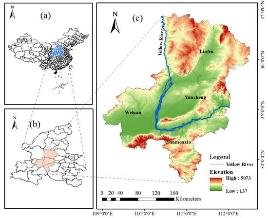 Location of the study area. (a) China, (b) the three provinces of Shanxi, Shaanxi, and Henan, and (c) the Yellow River Golden Triangle region. Created by ArcGIS 10.2 software (https://www.arcgis.com/).