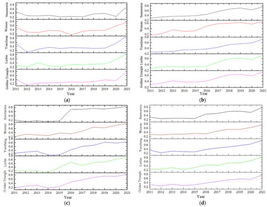 According to Figure 2c, the ecological environment development in the Golden Triangle Region of the Yellow River shows an upward trend overall. The development level of the ecological environment subsystem in the four cities was not high before 2016, generally below 0.4. However, after 2016, the development level of the ecological environment in the four cities rapidly improved. Among them, the development level of the ecological environment in Sanmenxia City was the worst among the four cities before 2016, and its ecological environment evaluation index was below 0.2. The comprehensive evaluation index of the ecological environment in Weinan City has grown steadily, showing a steady upward trend overall. The development level of the ecological environment in Yuncheng City was higher than that in Linfen City before 2014. After 2014, the ecological environment of Yuncheng City showed a gradual growth trend, while the ecological environment of Linfen City showed an upward trend overall, but the upward trend was unstable.