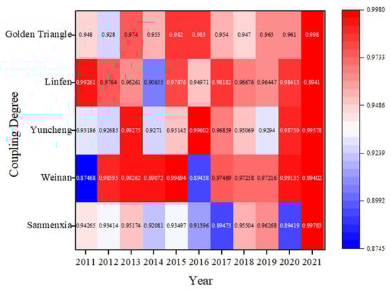 According to Figure 3, the WSE coupling degrees of the four cities in the Golden Triangle of the Yellow River region from 2011 to 2021 are all higher than 0.8, indicating a high-level coupling stage. This suggests that the water-resources subsystem, socioeconomic subsystem, and ecological environment subsystem in each city of the Golden Triangle of the Yellow River region are closely connected, and the subsystems strongly interact with each other. However, there were fluctuations in the coupling degree of each city during development. For example, the WSE coupling degree of Sanmenxia City dropped from 0.963 in 2019 to 0.894 in 2020. This indicates that although the WSE system in each city is well-coupled, the subsystem development is not stable, which affects the coordinated development of the WSE coupling to some extent.