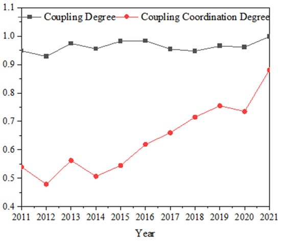 Based on the coupling-coordination degree model, the coupling degree and coupling-coordination degree of the WSE coupling system for various cities in the Golden Triangle of the Yellow River region from 2011 to 2021 are calculated, as shown in Figure 3, Figure 4 and Figure 5.