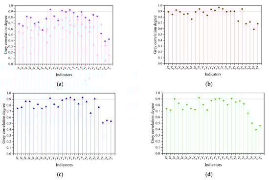 Gray relational analysis is a multi-attribute decision-making method proposed by Kuo et al. [33]. This method judges the closeness of different sequences by the similarity of the geometric shape of the sequence curves. Through gray relational analysis, the key factors affecting the coupling-coordination degree can be identified. The gray relational degree between the coupling-coordination degree and the selected indicators of each city in the Golden Triangle of the Yellow River is calculated, with the coupling-coordination degree selected as the reference sequence and each indicator as the comparison sequence. The calculation formula is as follows: