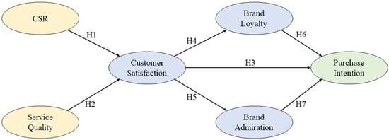 A company’s strategic efforts and customer loyalty are inextricably linked by customer satisfaction, which is usually considered a key measure of corporate success. Customer satisfaction increases a brand’s chances of brand loyalty, repeat purchases, and favorable word-of-mouth referrals [4]. In this regard, it is possible to think of CSR and service quality as strategic instruments for raising customer satisfaction. Numerous studies prove that CSR has a positive impact on customer satisfaction, especially if consumers perceive that a firm acts according to ethical and moral standards [5,6,7]. The positive relation between customer satisfaction and purchase intention has also been widely proved by the literature [8,9]. Businesses attempt to achieve purchase intention, which is the possibility that a consumer will buy a product or service. Various studies demonstrate that satisfied customers are found to have higher purchase intentions, particularly when such contentment is accompanied by high brand loyalty and admiration obtained from the customers’ feedback [10,11]. While the impact of CSR on consumer behaviors has become increasingly acknowledged, there is still a lack of studies that have examined the combined impact of CSR and service quality on customer satisfaction. There is a lacking number of such studies, especially in developing markets like Pakistan. While numerous studies have focused on the singular effects of CSR on perceived consumer perceptions, less well documented is how CSR and service quality interactively influence customer satisfaction and purchase intentions. This void in the literature has therefore left organizations in doubt regarding the impact of their CSR initiatives—when offered with high levels of service quality—on the loyal purchasing behavior of their customers. Therefore, the present study has been conducted to fill up that lacuna by observing the combined impact of CSR and service quality on customer satisfaction and brand loyalty towards the state of brand admiration and finally leading to buying intention within the Pakistani context. The research aim focused on how the CSR initiatives and service quality influence customer satisfaction and tried to indicate the mechanism through which aforementioned factors have an effect on the customer’s engagement. In fact, such relationships form the foundation for understanding how CSR and service quality together influence long-term customer loyalty and admiration to step up purchase intentions. This becomes particularly relevant for the Pakistani context since consumer awareness about CSR is on the rise. The mediating attributes between customer satisfaction and purchase intention are brand loyalty and brand admiration. Brand loyalty is defined as “the tendency of a consumer to stick to certain brands, usually due to long-term satisfaction and belief in that brand [12]. It can be added that loyal customers are not only willing to buy more, but they also become attached to the company, to the extent that minor lapses in service delivery may be overlooked, and they would still patronize them [13]. Brand admiration is defined as the strong, affectionate attachment a customer has for a brand, often with feelings of respect, trust, and caring [14]. This idealistic view, created by admirable brands, means that customers are highly likely to commit brand advocacy by influencing others in the same direction in choosing the brand. While brand loyalty and admiration mediate the relationship between customer satisfaction and purchase intention, some studies argue that purchase intention is very liable to external causes such as competitive pricing, product quality, and market trends [15,16]. Thus, brand loyalty and admiration are part of the reasons why customer satisfaction dominates in determining purchase intention.