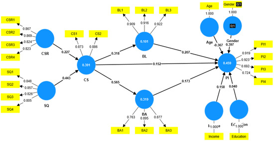 The hypotheses and conceptual model were evaluated using partial least squares (PLS) modeling, which is a variance-based structural equation modeling technique (Figure 1). For validation, it can be useful to test complex models using a smaller dataset. As far as sample size, data availability, and overall model complexity go, the PLS is more accommodating than its competitors [92,93]. For this study’s statistical analysis, we used SmartPLS 4.1.0. The program first establishes the validity of the instruments, and then it analyzes the interrelationships among the various components of the research framework. Using CFA, we conducted a series of reliability and validity tests on the following reflective constructs: convergent validity, discriminant validity, internal consistency reliability, and factor loadings. The constructs examined were corporate social responsibility (CSR), service quality (SQ), customer satisfaction (CS), brand admiration (BA), brand loyalty (BL), and purchase intention (PI). Items having factor loadings higher than 0.7 are highly satisfactory [94], while factor loadings of 0.5 or above are considered acceptable, the items with loading values of less than 0.5 should be dropped [95,96]. Each item had a factor loading of greater than 0.6, lending credence to the convergent validity of the constructs (Table 5) [90,95,97]. The reliability of the constructs was assessed using Cronbach’s alpha, which provided values greater than 0.7 in all cases. This indicates strong internal reliability and confirmatory competence [94]. The convergence validity of the constructs was demonstrated by the fact that the average variance extracted (AVE) values were greater than 0.5 [95]. The results can be trusted if the CR is more than 0.7, as recommended by [90].