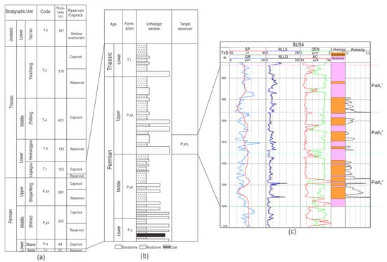 The stratigraphic units and reservoir of the Late Paleozoic age in the study area (modified from references [34,41,42]). (a) The strata of the Late Paleozoic age. (b) The lithology and reservoir of the Permian age. The fifth member of the Shiqianfeng Formation (P3sh5) suggests favorable reservoir conditions in this area. (c) The lithology and porosity of P3sh5 in well SU54. Drilling and logging data reveal well-developed sandstone reservoirs in this formation segment within the Yulin area with higher porosity. It is further divided into three smaller layers, named P3sh51, P3sh52, and P3sh53. SP: spontaneous potential; GR: gamma ray; RLLS: laterolog shallow resistivity; RLLD: laterolog deep resistivity; DEN: density; AC: acoustic interval transit time.