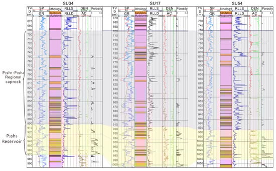 The reservoir–caprock assemblages Shiqianfeng Formation in the study area. The wells are SU34-SU17-SU54. Their locations can be found in Figure 1c. P3sh5 is the reservoir. Mudstone and sandy mudstone are developed from P3sh1 to P3sh4. These thick, continuously distributed, well-sealed strata with poor physical properties can function as a high-quality regional caprock. SP: spontaneous potential; GR: gamma ray; RLLS: laterolog shallow resistivity; RLLD: laterolog deep resistivity; DEN: density; AC: acoustic interval transit time.