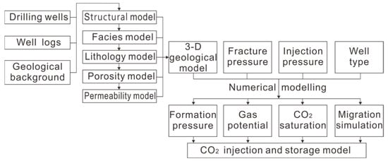 The workflow of geological modelling and numerical modelling in this study. The Petrel software was utilized to construct a 3-D geological model of the P3sh5 reservoir, notable for its low porosity and low permeability saline aquifers. Then, this study used the numerical simulation software Eclipse from Schlumberger to simulate CO2 injection and storage, analyzing the evolution of formation pressure, changes in CO2 saturation, and the characteristics of CO2 migration.