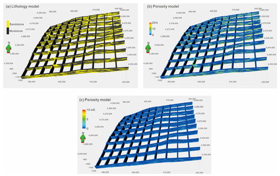 Three-dimensional geological modelling is a widely adopted technique for projecting the 3-D spatial traits of geological layers, including models of structure, facies, lithology, and physical properties of strata. In this study, a 3-D geological model of the P3sh5 reservoir was constructed by way of the Petrel software (2021), notable for its low porosity and low permeability saline aquifers (as illustrated in Figure 4). Initially, a structural model for P3sh5 was generated from the stratified data of 28 drilling wells within the study area. The P3sh5 strata were subdivided into three sub-layers and were gridded accordingly. The P3sh5 reservoir area was divided into a comprehensive grid matrix of 332 × 301 × 152 grids, totaling 15,189,664 cells. A facies model ensued, where the lithological information from drilling was incorporated for upscaling. The spatial variability of the sandstone body was analyzed with a variogram. Notably, the distributary channel sandstone bodies within the P3sh5 reservoir represent superior quality sandstones, which are optimized for GCS. Using drilling data for both lithology and sedimentary facies, the variogram data for the three layers were determined, achieving an apt fit with the variogram curve to the scatter plot (Table 1). This indicated an alignment between our defined variogram and the known sedimentary principles governing the P3sh5 reservoir. The model utilized well data and sedimentary facies maps, applying a sequential indicator simulation method to draft the lithology model and visibly delineate the spatial distribution of sandstone and mudstone (Figure 5a). Subsequently, based on the lithology model, a porosity model was developed deploying the logging porosity data (physical property data source from logging data according to reference [52]). A sequential Gaussian simulation was employed to characterize the porosity distribution within the sandstone body (Figure 5b). The validity of the porosity model was corroborated against the logging porosity, model coarsening, and bar charts of the 3-D porosity model. A notable congruence between the modeled porosity and the actual drill well data was observed, establishing the model’s capability to accurately represent the physical attributes of the P3sh5 reservoir. The permeability model, which utilized the porosity model for calculation (Figure 5c), referred to empirical data to fit the relationship between permeability and porosity pertinent to the Permian channel sandstones in the Ordos Basin. The formula is expressed as follows: