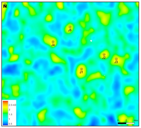 A critical finding was the evident mudstone interlayer within the P3sh53 sub-layer, dividing it into an upper sandstone body and a lower one. With significantly superior physical properties, the lower sandstone body emerges as the preferred choice for CO2 injection (Figure 6). Given the extensive research area of about 1000 km², identifying sandstone bodies with optimal physical characteristics for drilling and injection is crucial. The average permeability of the P3sh53 sub-layer mainly ranges between 0.1 and 2.5 mD. The designed injection wells were chosen in the sandstones with the highest permeability. Sandstone bodies with an average permeability exceeding 1.5 mD were selected, and a total of 5 designed wells were chosen, named wells J1 to J5 (Figure 7).