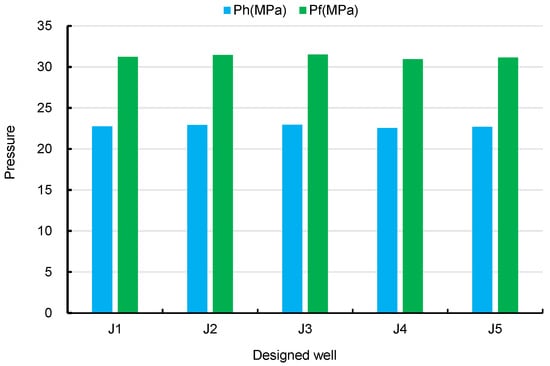 The fracture pressure (Pf) and formation pressure (Ph) of the P3sh53 reservoir in the designed wells of the Yulin area. The formation pressure and fracture pressure of the 5 designed wells in the study area were calculated, with formation pressure ranging from 22.55 to 22.95 MPa and fracture pressure from 30.95 to 31.50 MPa.