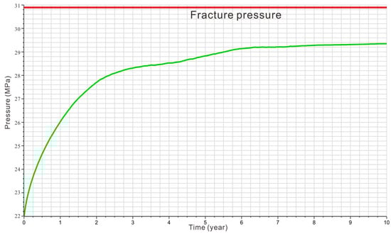 The variation in the formation pressure during the injection of Scenario 3 of the designed well J1 of the Yulin area. The formation pressure does not exceed the fracture pressure, ensuring the safety of CO2 injection.