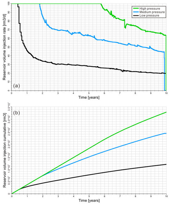 The variation in the injection rate and injection volume of different injection pressures in the designed J1 well of the Yulin area. (a) Injection rate (m3/day); (b) injection volume (m3). The green line represents the high-pressure injection (Scenario 3). The blue and black lines are the medium-pressure and low-pressure injections, respectively (Scenarios 4 and 5). The injection volume at a high injection pressure was 2.9 times higher than that at a low injection pressure.