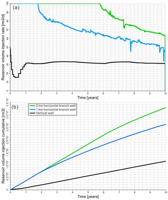 The variation in the injection rate and injection volume of different well types in the designed J1 well of the Yulin area. (a) Injection rate (m3/day); (b) injection volume (m3). The black line represents the vertical well injection (Scenario 1). The blue and green lines are the 1 km and 2 km horizontal branch well injections, respectively (Scenarios 2 and 3). The “horizontal branch well injection” method enhances the injection volume.
