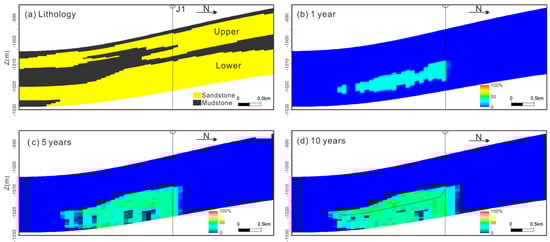 The analysis of CO2 migration involves examining the changes in the saturation and other properties of CO2 during the injection process by employing monitoring or numerical simulation methods. This characterization is key to assessing the safety and efficiency of GCS and serves as a crucial component in evaluating CCUS projects [6,58,59,60]. The numerical simulation results indicate that, when CO2 is injected into the lower sandstone body through a horizontal branch well, the CO2 saturation reaches approximately 50% (Figure 12). Because of the substantial amount of irreducible water in saline aquifers, which is characterized by low porosity and permeability [61], the saturation of CO2 remains low to moderate. The distribution of CO2 in the vertical section primarily centers around the horizontal interval of interest, extending outward progressively. The vertical migration distance over 10 years remains within a 10 m range, suggesting that CO2 migration primarily occurs within the lower sandstone body. After the injection process finishes, CO2 is securely contained within the lower sandstone body (Figure 12). On a horizontal plane, CO2 migrates only up to 700 m around the horizontal interval of interest and long-distance migration does not occur (Figure 13).