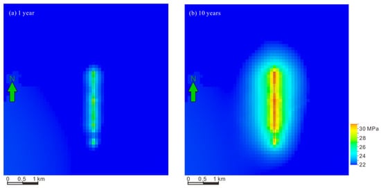 During the process of CO2 injection, the injection pressure significantly exceeds the original pressure within the reservoir. This discrepancy can cause a rise in the formation pressure near the interval of interest. According to the results of the numerical simulation, after 1 year of injection, the formation pressure near the horizontal interval of interest escalates quickly. Specifically, within a radius of 100 m around the interval of interest, the formation pressure increases to approximately 27.00 MPa (Figure 14a). After 10 years, this increase in the formation pressure extends over a broader area, reaching a peak value of about 30.90 MPa (Figure 14b). After the injection process, the formation pressure in the area surrounding the injection area begins to decline gradually, ultimately stabilizing at a maximum of roughly 25.00 MPa in 50 years.