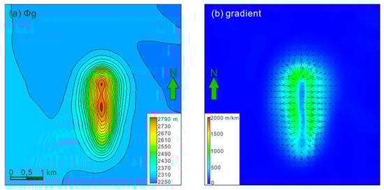 The distribution of the gas potential and its gradient in the P3sh53 reservoir of the 2 km horizontal branch well in the designed J1 well of the Yulin area. (a) Gas potential after 10 years of injection. The gas potential near the injection well is the highest, approximately 2790 m. The gas potential in the west is about 2300 m, while the potential in the east is the lowest, roughly 2250 m. (b) Gradient of gas potential. Around the injection interval, the gradients are about 900–1100 m/km, indicating sufficient migration dynamics there. This might induce the preferential direction of CO2 migration, favoring these two directions.