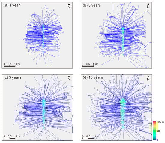 Using the designed J1 well as an example, a horizontal branch well was drilled into the lower sandstone body of the P3sh53 sub-layer, which is about 10 m thick. The horizontal branch well extends in the direction of the sandstone body’s sediment, from north to south. The lengths are around 1 km and 2 km. After 10 years, the injection rate of a 2 km horizontal branch well decreased from an initial 100 to 63 m3/day, achieving a cumulative injection volume of approximately 328,580 m3 in 10 years (Figure 11). The favorable continuity and physical properties of the sandstone body allow the design of the horizontal branch wells to substantially increase both the rate and the volume of CO2 injection. A comparison between Scenario 1 and Scenario 3 reveals that the “horizontal branch well injection” method enhances the volume of injection by about 2.87 times (Figure 11). It is evident that the migration range of CO2 injected into horizontal branch wells is significantly larger compared to vertical well injection. This method allows for the utilization of more reservoir pores to CGS, leading to a substantial increase in the injection volume.