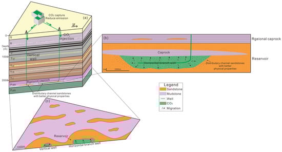 Based on the above analysis, this study summarizes the CO2 injection and storage model in the Ordos Basin’s saline aquifers. While implementing GCS, it is crucial to identify relatively high-quality distributary channel sandstone bodies in integrally low porosity and low permeability strata. Both vertical and horizontal branch wells can be employed for CO2 injection (Figure 17a). Horizontal branch well injection evidently facilitates more substantial CO2 storage. In the vertical section, CO2 migration is predominantly confined to the sandstone body adjacent to the horizontal interval of interest (within a vertical range of 10 m). The mudstone inter-layer serves as the caprock, with a regional caprock situated above the reservoir (Figure 17b). Thus, the safety of GCS is well assured. Horizontally, CO2 spreads from the injection interval to the surrounding area, accumulating within a 700 m range (Figure 17c). Compared to a vertical well, a horizontal branch well significantly enlarges the migration area of CO2 on the plane, thereby enhancing CO2 injection and storage amount.