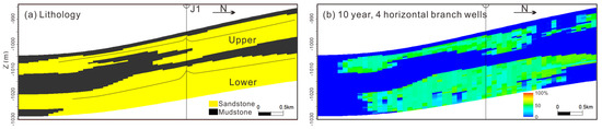 The type of injection well plays a crucial role in determining CO2 migration within saline aquifers [28,46,47]. Since the injection rate for CO2 in the saline aquifers of the study area is relatively low, the total injection volume through a vertical well within 10 years amounts to only 114,320 m3. To enhance the efficiency of CO2 injection, this study proposed utilizing horizontal branch wells of 1 km and 2 km in length to augment the injection volume (Figure 11).