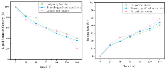 Figure 2 shows t water-retention agents’ liquid holding capacity and release rate for different biocides. Calculations reveal that the liquid retention capacity of the super absorbents gradually decreases over time. Within 120 h, the liquid retention capacity for the biocides exceeds 40%. Both types of super absorbents demonstrate strong liquid retention capabilities, with polyacrylamide exhibiting a higher retention capacity compared to starch-grafted acrylate. The release rate of the biocide from the super absorbents begins to slow down after 24 h. Importantly, the release rate of polyacrylamide consistently remains lower than that of starch-grafted acrylate as well as deionized water. These findings indicate that both super absorbents possess strong liquid retention abilities for the biocides, with polyacrylamide proving particularly effective for the slow release of sodium dodecyl sulfate.