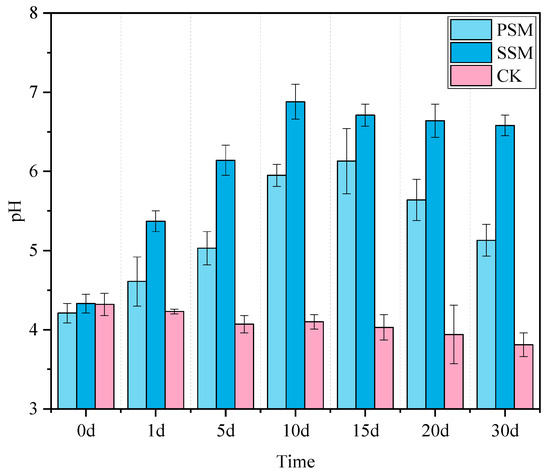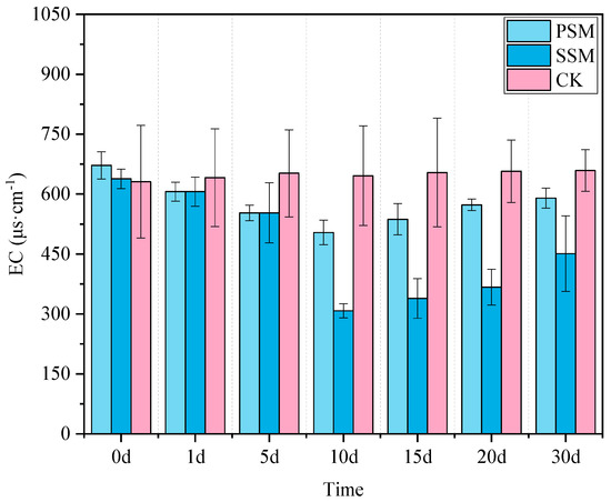 Figure 5 shows the change curve of electrical conductivity of gangue leaching solution. Soluble salts precipitate on the surface of coal gangue. In the CK group, the electrical conductivity (EC) of the coal gangue leachate gradually increased over time. The PSM group reached its lowest EC value of 504.28 mg·L−1 around day 10, reflecting a reduction of 25%. In contrast, the SSM group exhibited a more pronounced decrease in EC, reaching its minimum on day 10 with a reduction of 51.72%. The incorporation of biochar and water-retaining agents effectively extends the material’s capacity to mitigate the salinity associated with the acidic coal gangue.