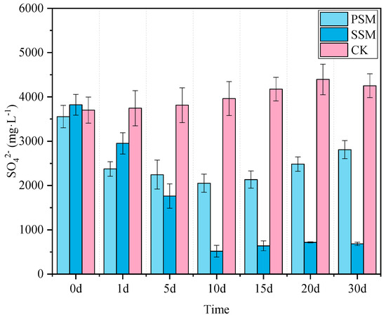 Figure 4 shows the change curve of sulfate content in gangue leaching solution. In the CK group, the concentration of SO42− ions gradually increased due to the activity of oxidizing bacteria. The PSM group reached its lowest SO42− ion concentration on day 10, with a sulfate reduction rate of 42.28%. Similarly, the SSM group recorded its minimum SO42− ion concentration on day 10, achieving a significantly higher sulfate reduction rate of 86.45%. By day 30, the sulfate reduction rate in the SSM group remained above 80%. Sulfate-reducing bacteria convert SO42− ions in weathered coal gangue into S2−, which reacts with H+; to produce H2S. This process effectively decreases sulfate concentration and promotes the reduction in sulfate ions. The bactericide plays a crucial role in mitigating the oxidative activity of oxidizing bacteria. Additionally, the addition of biochar and water-retaining agents can extend the remediation duration, with an effective period lasting approximately 30 days.