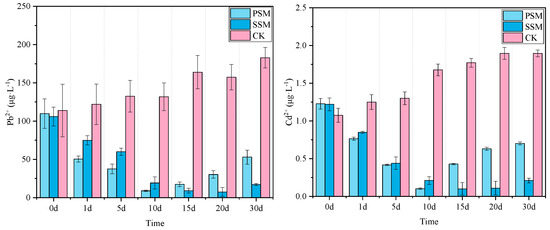 Figure 6 shows the change curves of Pb2+ and Cd2+ in gangue leaching solution. In the treated coal gangue leachate, the concentrations of Pb2+ and Cd2+ initially decreased before rising again. In the CK group, the concentrations of Pb2+ and Cd2+ showed a consistent upward trend over time. However, the PSM group, which incorporated sulfate-reducing bacteria and a bactericide, achieved its lowest concentrations around day 10, with a Pb2+ removal rate of 91.8% and a Cd2+ removal rate of 91.66%. In the SSM group, which included biochar and water-retaining agents, the Pb2+ concentration reached its minimum on day 20, achieving a removal rate of 92.99%. By day 30, the Pb2+ removal rate remained above 80%. Similarly, the Cd2+ concentration in the SSM group peaked on day 15, attaining a removal rate of 91.80%, and also remained above 80% by day 30.