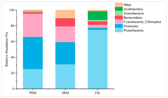 The microbial diversity of coal gangue under various treatments is summarized in Table 9. Notably, the Shannon index for the CK group was higher than that of the PSM and SSM groups, while the Simpson index was lower, indicating that the CK group exhibited greater biological diversity. Additionally, the Simpson index suggests that the microbial diversity on the surface of the remediated coal gangue was lower than that of the original coal gangue due to the effects of the treatment materials. Furthermore, both the Chao1 and Ace indices for the SSM group were lower than those of the other groups, indicating a reduced number of species. Over time, as the coal gangue underwent weathering, the diversity of bacterial communities gradually increased, accompanied by a rise in species abundance. However, the introduction of composite materials led to a decrease in both bacterial community diversity and species richness.
