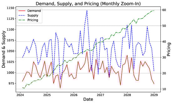 The following figures (Figure 1 and Figure 2) illustrate the trends in supply, demand, and pricing over time, segmented into daily, monthly, and yearly intervals.