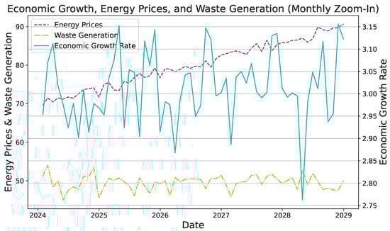 The generated synthetic dataset supported scalability across various market scenarios, ensuring that the framework remained adaptable and flexible for extended CE marketplace studies. The dataset used in this study contained daily, monthly, and yearly records of the key variables, including supply, demand, waste generation, pricing, economic growth rate, resource availability, and energy prices. Synthetic data were generated to simulate the AI-driven digital marketplace’s operations over an extended period, allowing for an in-depth analysis of the relationships between these variables. Summaries of the statistics for the dataset are provided in Table 2 and Table 3.