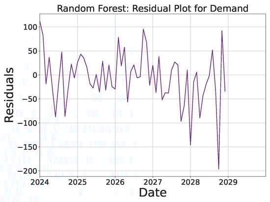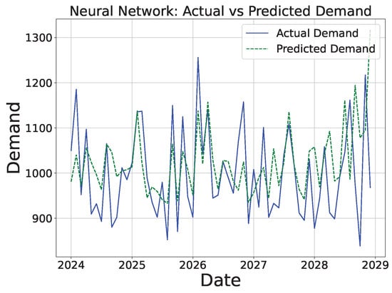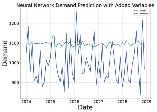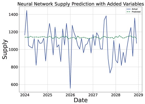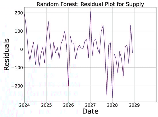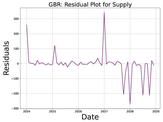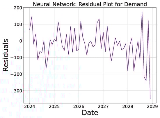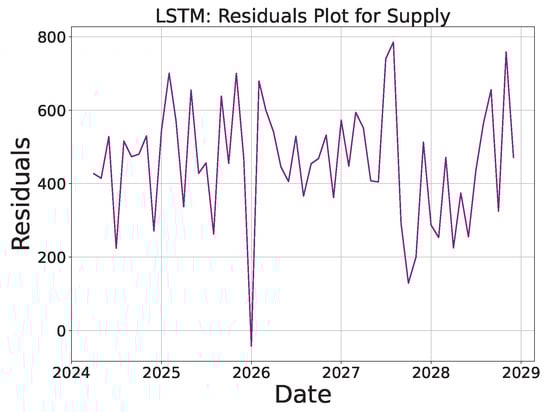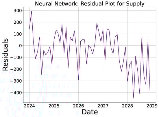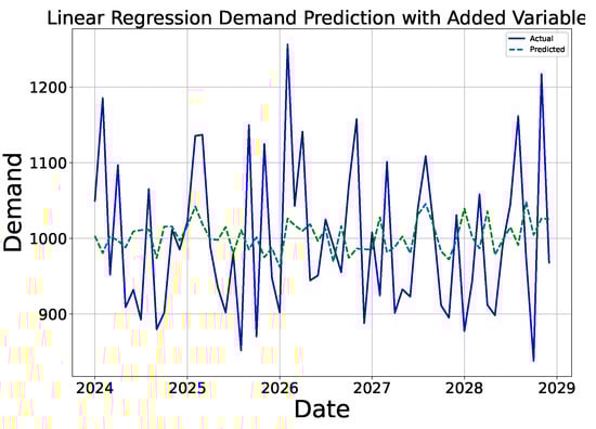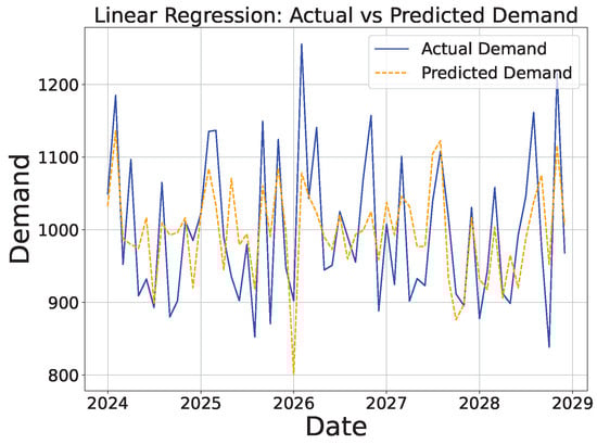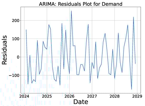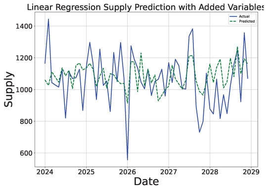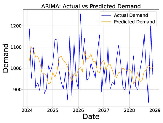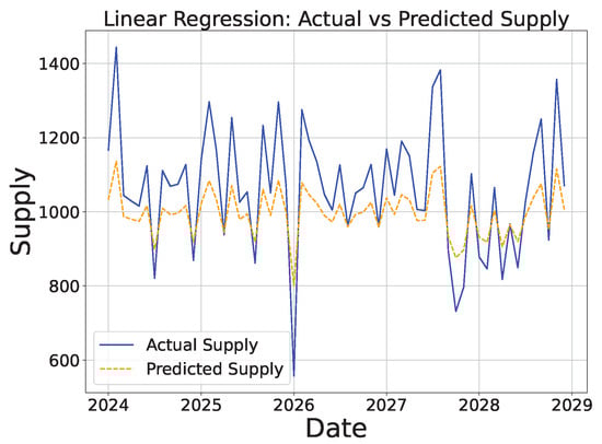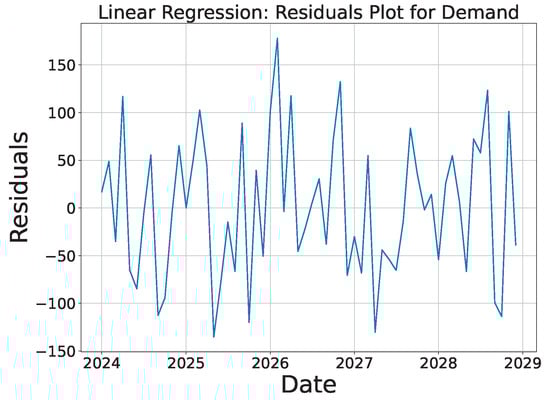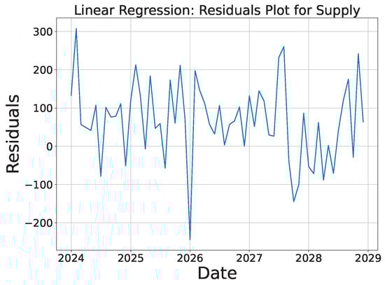 where represents the predicted demand or supply, denote predictor variables, is the intercept, and is the residual error. Although linear regression identifies linear dependencies, it has limitations in handling the nonlinear dependencies in CE systems, where complex interactions are often present [22]. Combining ARIMA’s strength in capturing periodic trends with linear regression’s ability to model linear trends may form a hybrid approach to address more complex forecasting requirements, particularly for systems exhibiting both seasonal and trend-based fluctuations.