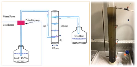 The design of the UASB reactor was adapted from the original design presented by Chimhundi et al. (2021) [33]. The modification involved introducing the feed flow from the bottom of the column. The reactor featured four potential effluent exit points along its height, with three designated sampling ports labelled 1, 2, and 3, positioned at different heights along the vertical axis. The fourth exit point served as an overflow to a waste collection point. The entire column was housed in a warm room maintained at a temperature of 30–35 °C, while the reactor feed was stored separately at 5 °C to minimize microbial growth and the risk of cross-contamination. The feed was spiked with varying Pb(II) concentrations of 80, 250, 500, 1000, and 2000 ppm, using Pb(NO3)2 as the contaminant source. The feed was supplemented with a nutrient broth containing either 5 g/L or 15 g/L of yeast extract and 1 g/L of NaCl. It was pumped at a constant flow rate of 0.86 mL/min (equivalent to 1238 mL/day), resulting in a hydraulic residence time (HRT) of 8 days. A dripper system was used to introduce the feed into the column, as visually represented in Figure 1.