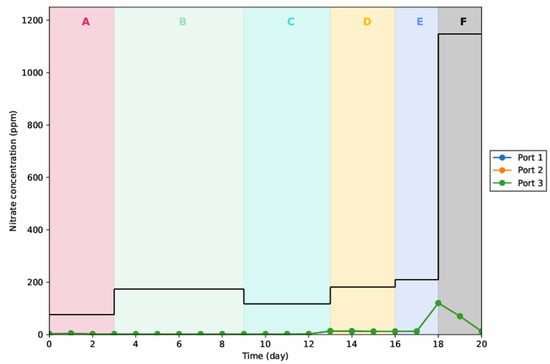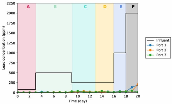 Pb(II) concentrations measured at ports 1, 2 and 3 respectively in Run 1. The letters (A–F) at the top of the graph represent the different influent conditions mentioned in Table 3, i.e., Section A-80 ppm feed.
