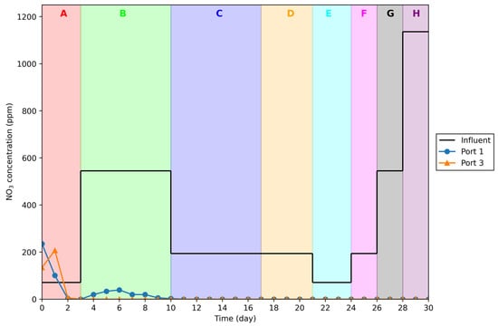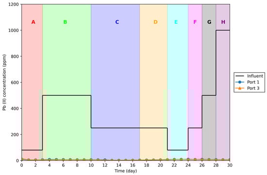 Pb(II) concentrations measured at ports 1 and 3 respectively in Run 2. The letters (A–H) at the top of the graph represent the different influent conditions mentioned in Table 4, i.e., Section A-80 ppm feed.