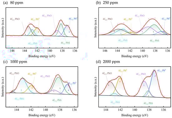 The XPS results confirm the presence of PbS in the precipitate across all four tested concentrations. Additionally, elemental lead (Pb0) and lead oxide (PbO) were also detected. The presence of PbO is likely due to the oxidation of elemental lead, serving as an indicator of elemental Pb within the sample. Figure 4 displays the XPS profiles corresponding to Pb(II) loadings of 80, 250, 1000, and 2000 ppm, highlighting the variations in lead species across the different concentrations.