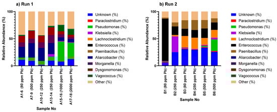 By contrast, Aliarcobacter [58,59], a Gram-negative microaerophilic bacterium, was more prominent in Run 1, particularly at lower Pb concentrations (500 ppm and below). However, its presence declined sharply in Run 2, suggesting that the microaerophilic conditions it favours were no longer dominant in Run 2. In Run 2 this genus was hardly detected as opposed to Run 1 when relative abundance reached a maximum value of 38% between 80–250 ppm. This is a strain that is commonly found in the gut microbiota of farm animals and is a foodborne pathogen. It is highly mobile in water and its detection may be linked to the origin of the microbial consortium [59]. Its antimicrobial resistance was likely to be the cause of its survival in the Pb(II) contaminated environment, but no solid Pb(II) removal mechanisms associated with this genus have been established yet [58].